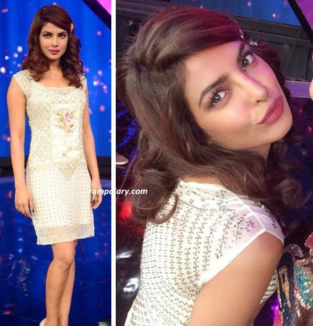Wearing a Bluegirl dress, Priyanka Chopra went to the sets of Raw Star launch. She paired the dress with an Atelier Mon ring and a lovely earring which she worn as a hair clip. She looked good in soft curls. Personally I Loved the whole look.