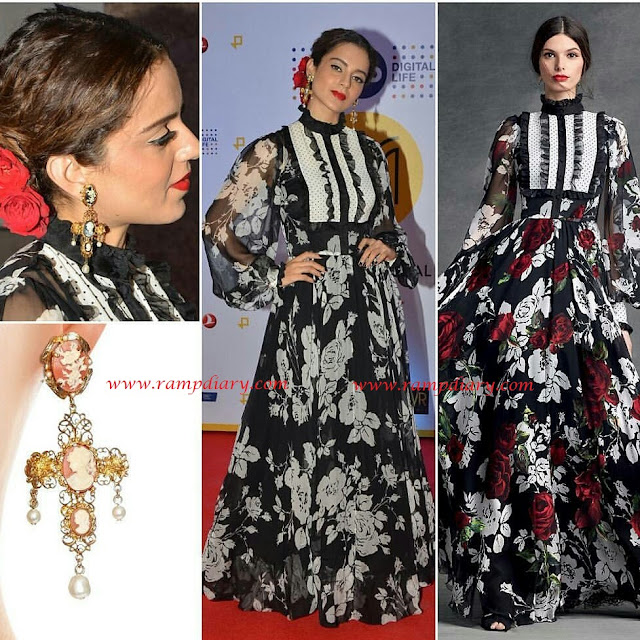 Kangana Ranaut recently opted for a black and white look where she wore a floor length gown by Dolce & Gabbana. With a hint of red on lips and hair(flowers) the actress flared well in this look. Though her golden earrings were not going that well the outfit but Miss Ranaut managed to look good. We like!