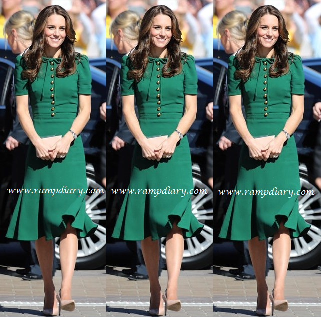 Kate Middleton was recent seen in a green knee length frock by Dolce and Gabbana during her recent visit to British Columbia. She also wore heels by Bennett and earrings by Monica Vinader. Kate looked pretty 🙂