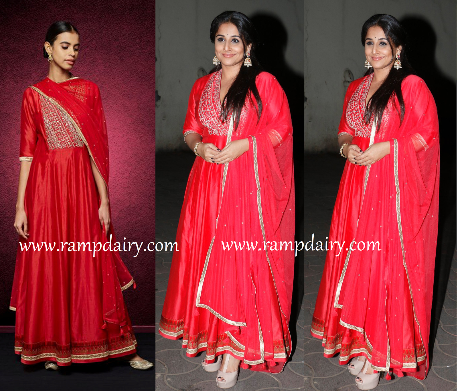 We saw Vidya Balan in a red floor length anarkali suit by Anita Dongre during recent Diwali celebrations. Here she is wearing jewelry from Pink City by Anita Dongre and was styled by Pranay. We like her in this Indian look. Do you like her festive look?