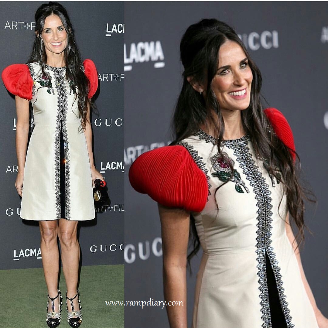 For a recent event, Demi Moore opted for a mid length black and white red ruffled sleeved dress from Gucci where she kept her hair half pinned up and went for mild makeup. She looked gorgeous in this look! Isn’t she?