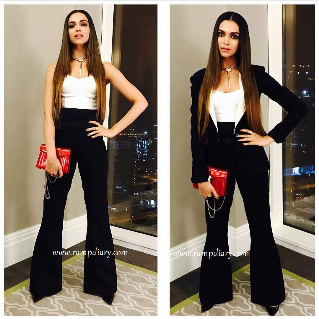 Wearing a monochrome outfit by designer Monisha Jaising, Deepika Padukone picked up the International Star of the Year Trophy at Esquire Middle East MAHB Awards in Dubai. She completed her look with iron pressed hair, Bvlgari jewelry and a red hand bag. The actress looked fine but I am really not a fan of these bell bottoms and iron pressed hair look! What about you?