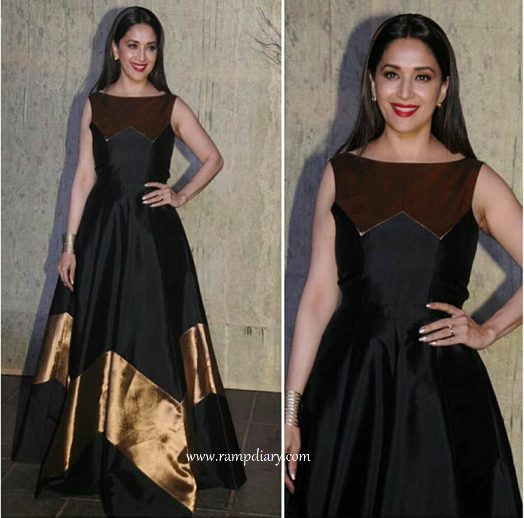 Celeb Fashion, Fashion · December 9, 2016Madhuri Dixit In Rajat Tangri Madhuri Dixit Picked up a floor length gown by Rajat Tangri for her attendance at Manish Malhotra’s 50th Birthday bash. With red lips, open straight hair, Madhuri looked super pretty at the event. Madhuri Dixit In Rajat Tangri
