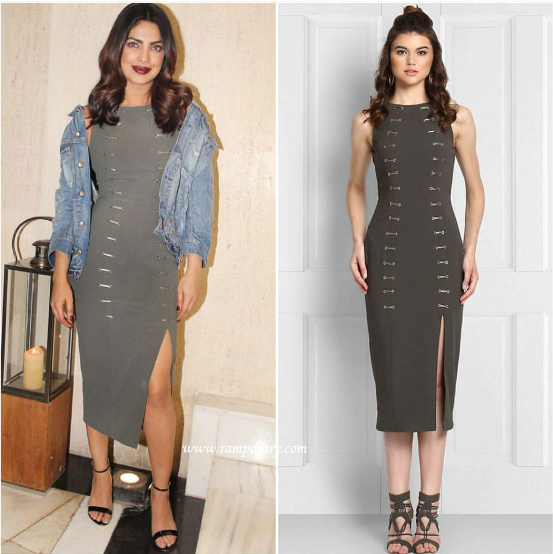 Priyanka Chopra picked up a sheath dress from Lulu and Sky while attending a party thrown in her honor by designer Manish Malhotra. She opted for a denim jacket to complete her outfit and wore sandals by Francesco Russo. Miss Chopra looked fine in this dark lips look.
