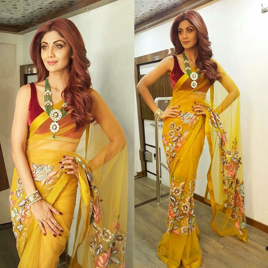 Celeb Fashion, Fashion · December 8, 2016Shilpa Shetty In Manish Malhotra Red haired beauty Shilpa Shetty picked up a lemon yellow sari by Manish Malhotra for taping the recent episode of the Super Dancer Show. The actress looked pretty in this sari look. What say? Like what you see? Shilpa Shetty In Manish Malhotra