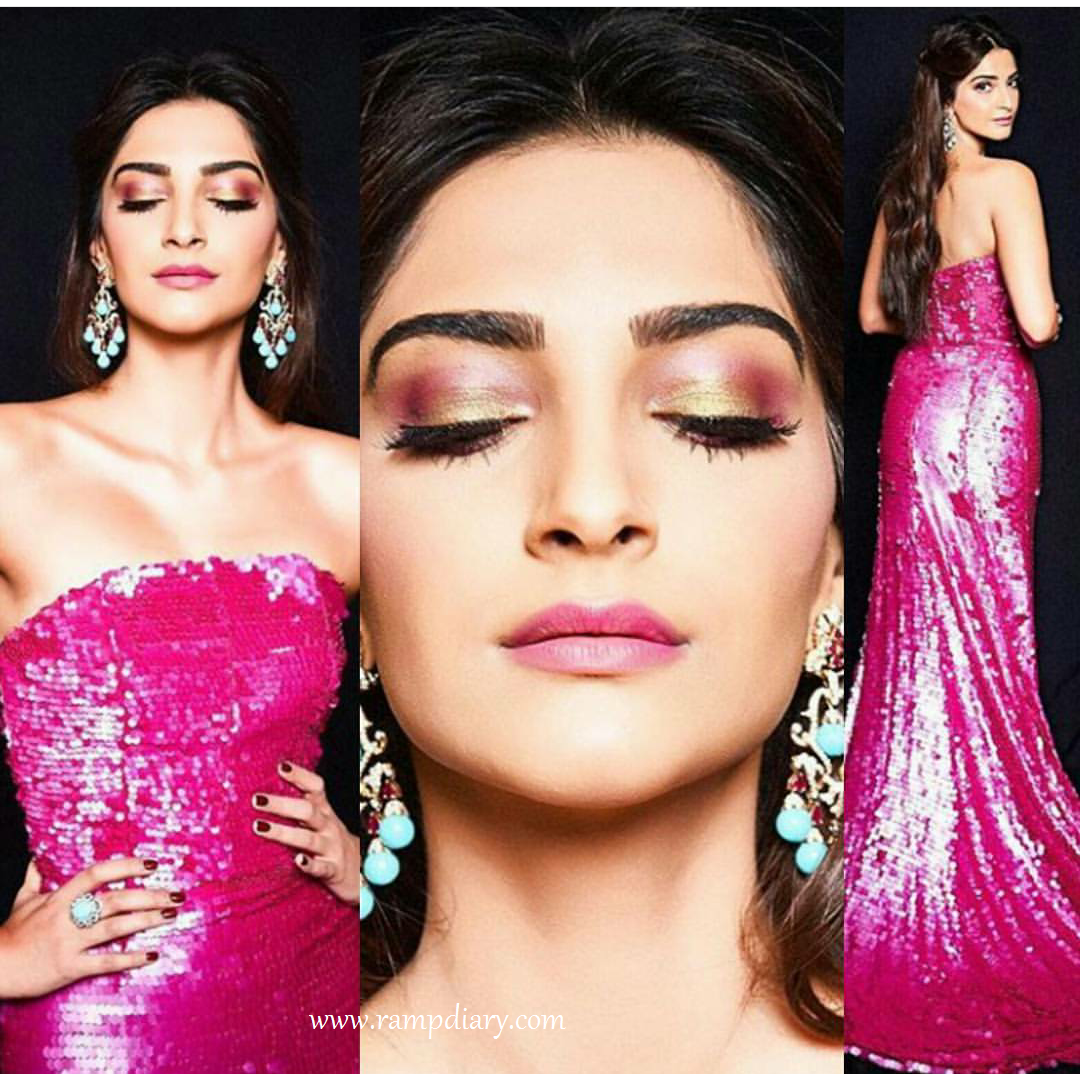 For attending Brand Vision Awards, Sonam Kapoor opted for a pink shimmery gown by Caroline Hayden. She completed the look with half pinned up messy hair with light blue jewelry. Though this dress is not our kind but actress flared well in this look. Like?