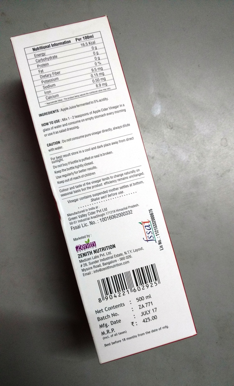 of them. I liked its packaging which was simple and easy to use. I ordered the quantity of 500 ml and it come in a thick plastic square bottle. The cap is white in color and was sealed as expected. I started taking This ACV*