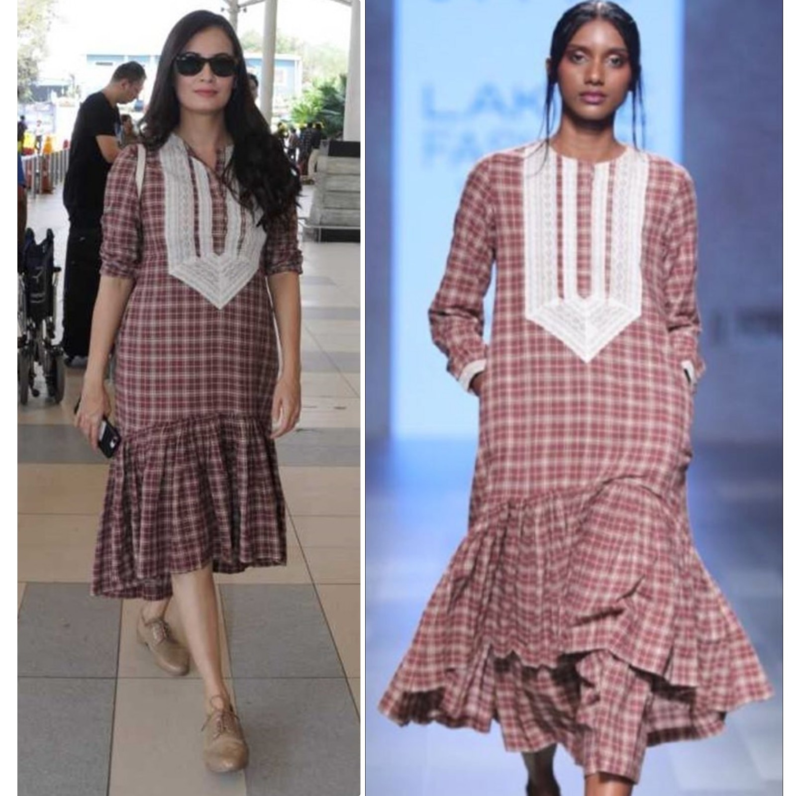 Celeb Fashion, Fashion · March 9, 2018Dia Mirza in Divya Sheth at the airport Dia Mirza picked up a red and white knee length checked dress while at the airport. Her airport look got finished off with open hair and black shades. Though don’t have much liking for the dress but Dia looked pretty. What do you think?