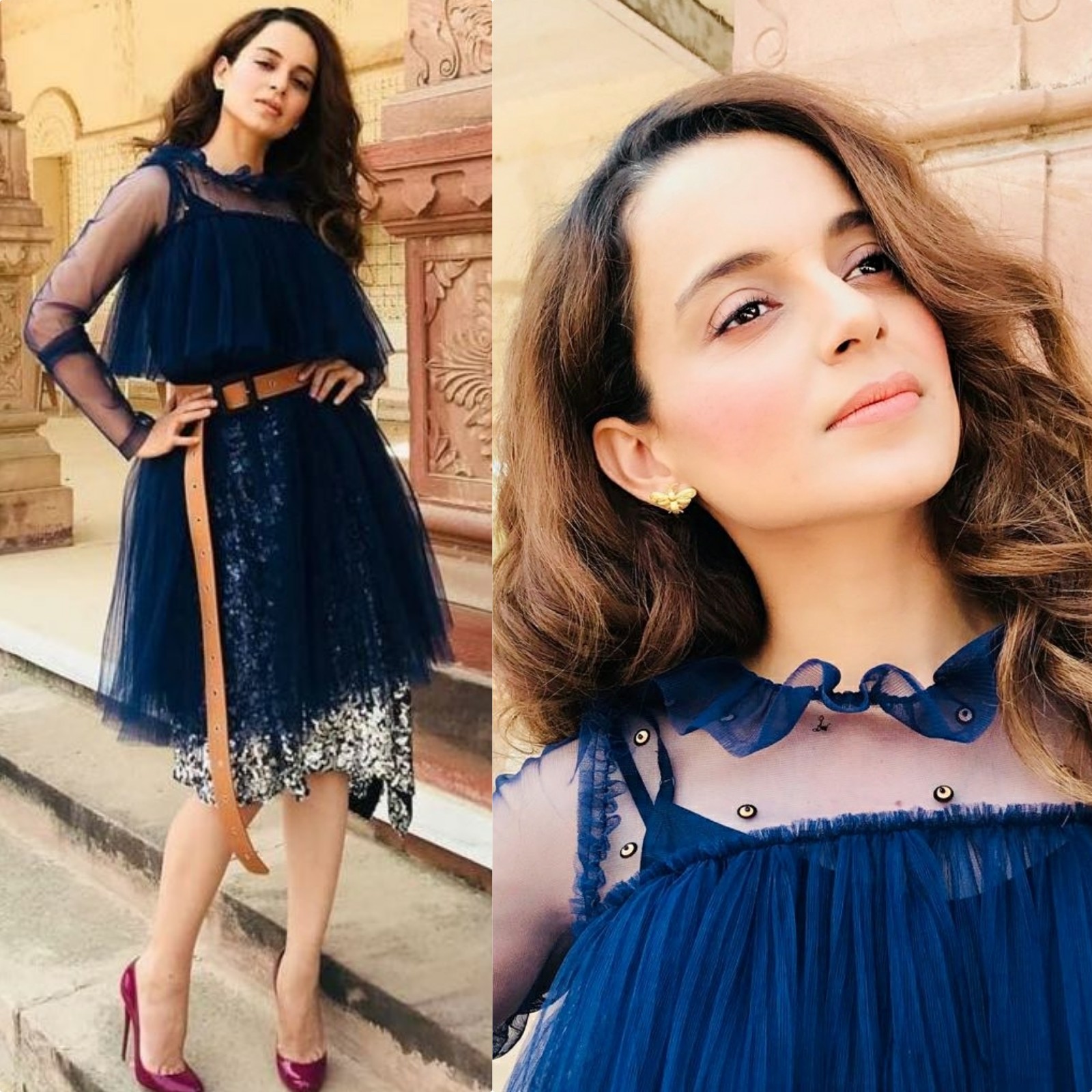 Kangana Ranaut was recently seen in two Looks. In the first look she was seen wearing a blue knee length dress with burgundy color pumps. Her look got finished off with open hair and mild makeup.