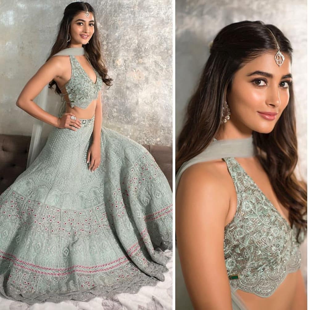 Celeb Fashion, Fashion · March 8, 2018Pooja Hegde in Jade by MK Pooja Hegde picked up a light color lehenga choli from Jade by MK. She finished off her look with half pinned up hair which she decorated with a maang tika. Her makeup was mild and skin looked flawless. Miss Hegde looked pretty!