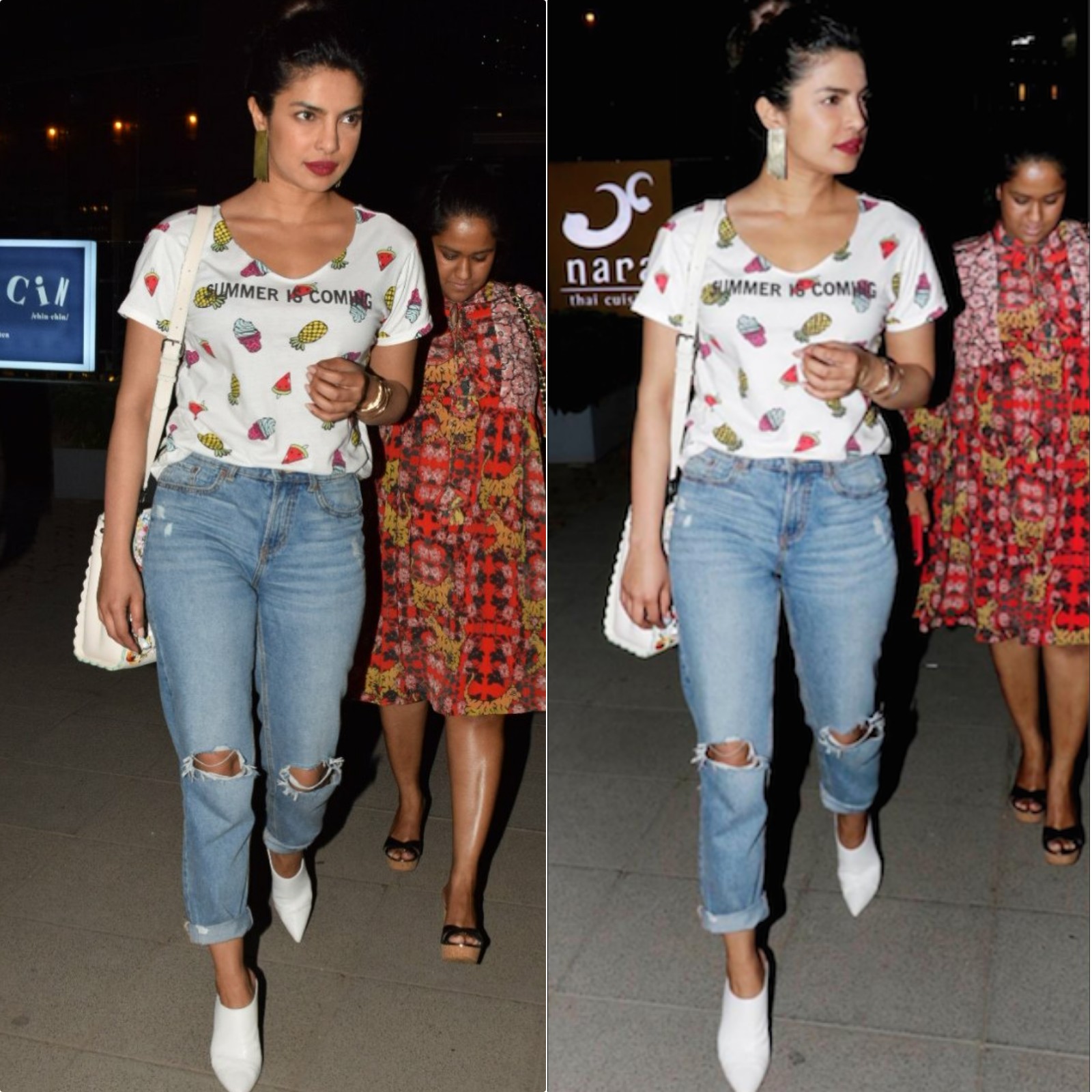 Priyanka Chopra was recently snapped wearing casuals while out for dinner in Mumbai. She looked very pretty in this candy print tee which she paired with light blue ripped denims. Those white shoes seems to be her recent favorites as she wore them on couple of other occasions as well. Check out one of her earlier look wearing these white shoes here.