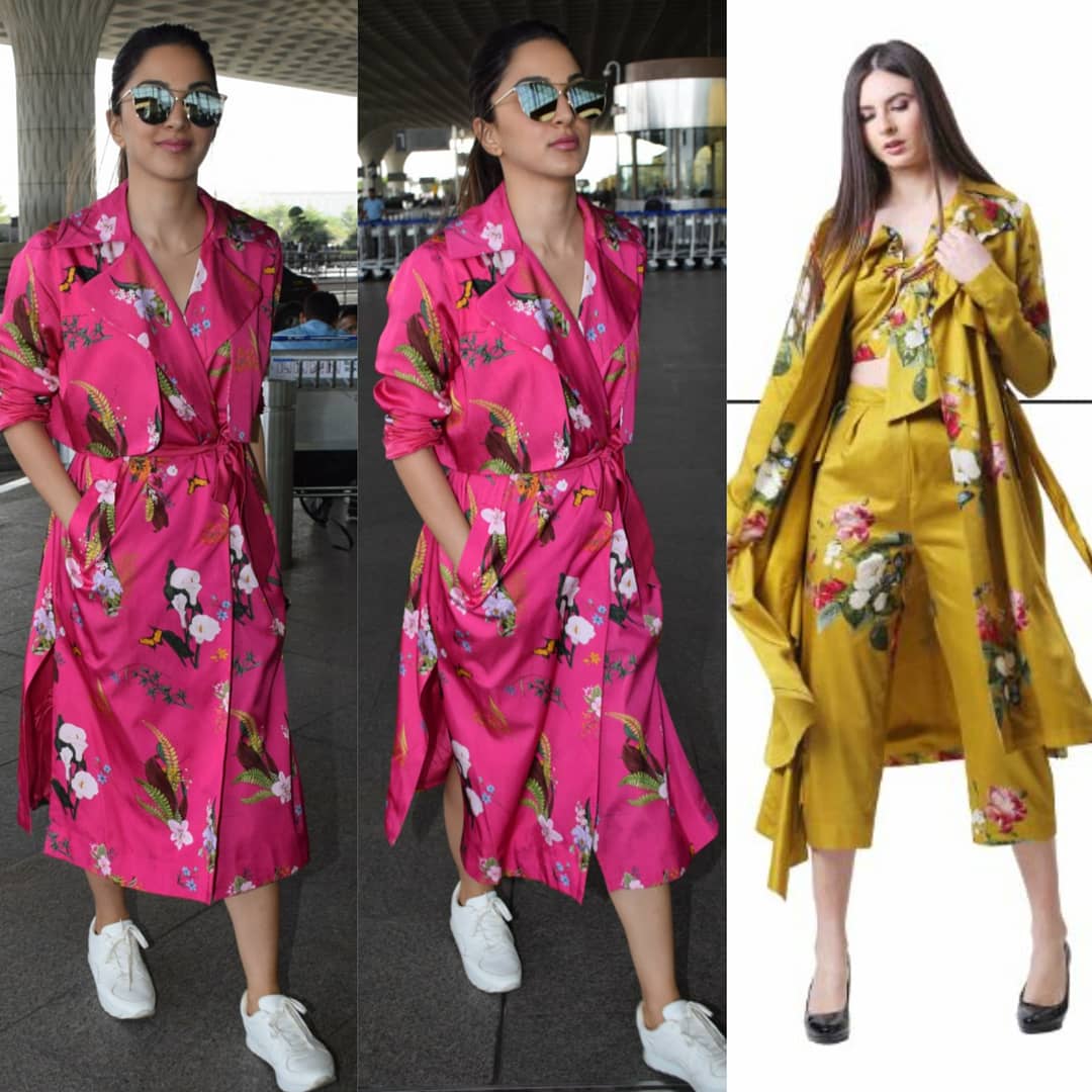 Kiara Advani was snapped at the airport wearing a floral print pink trench by designer Mahima Mahajan. A pony, black shades and white canvas shoes completed her look!