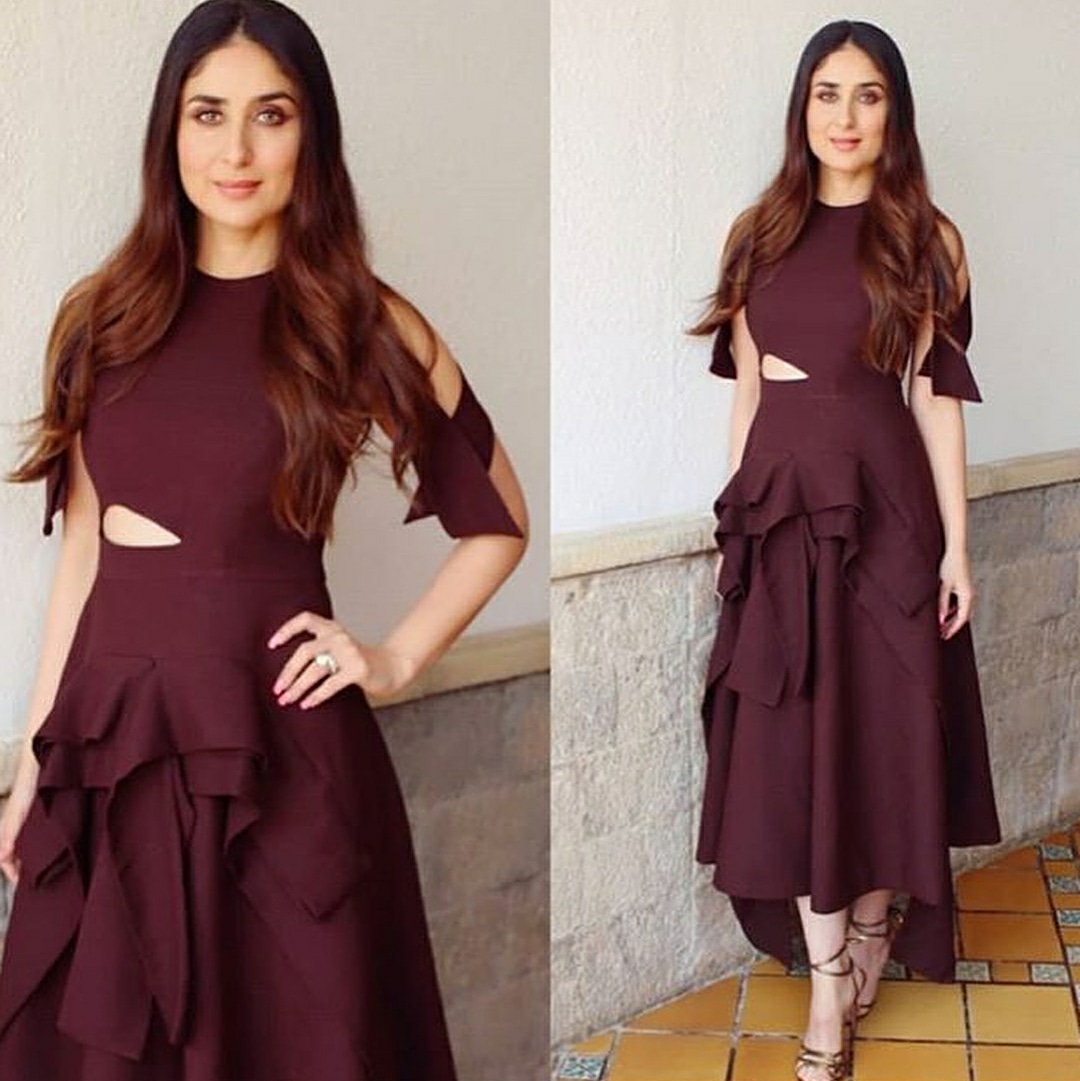 For the recent rounds of promotions of Veere Di Wedding, Kareena opted for a Meena Official dress. Her look was simple and sober and she opted for open hair and mild makeup. Though her open hair looked good but this open hair look seemed little monotonous as she is very often seen in the same hair style these days.