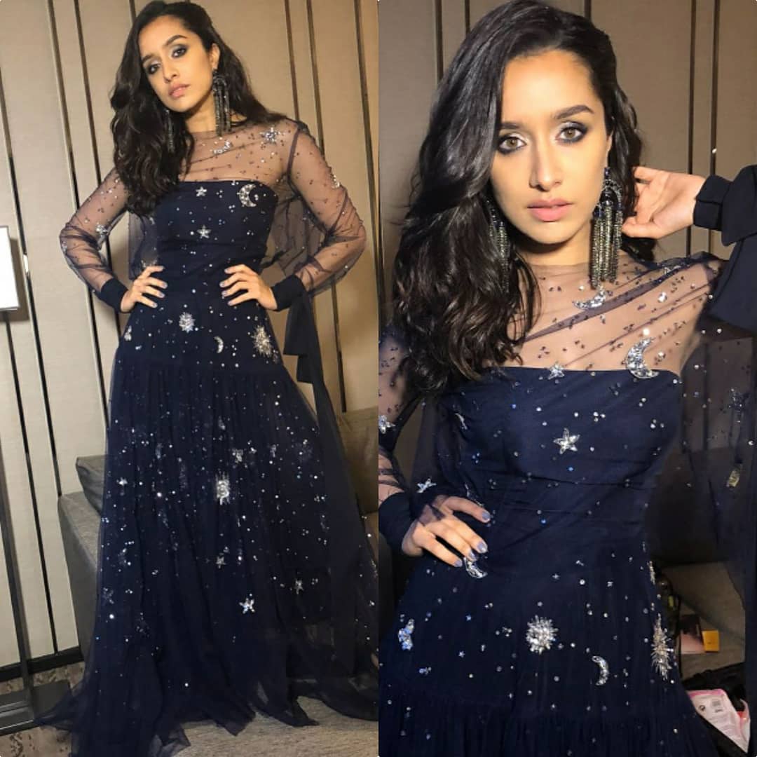 Shraddha Kapoor picked up an embellished navy blue gown by Reem Acra at her appearance at IIFA