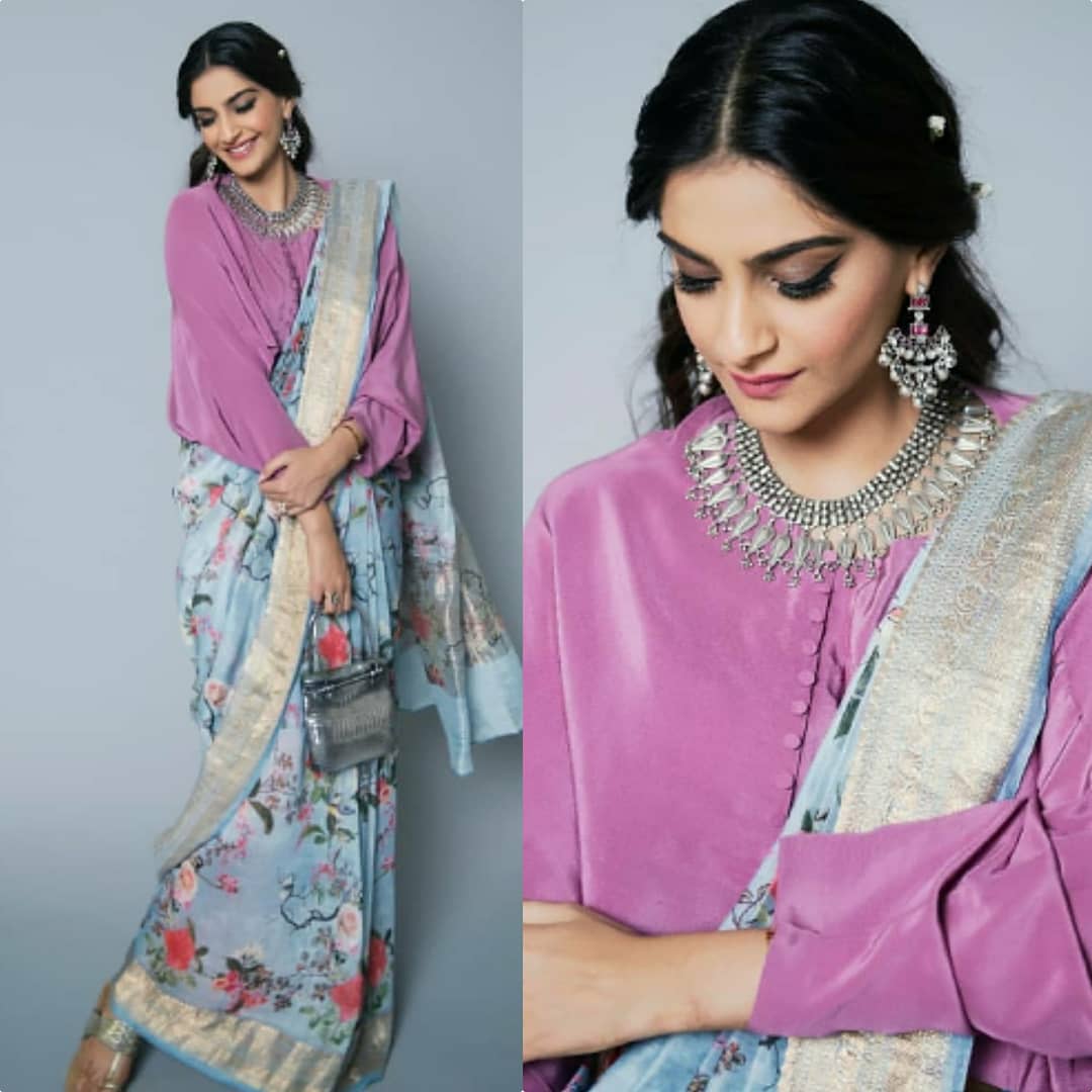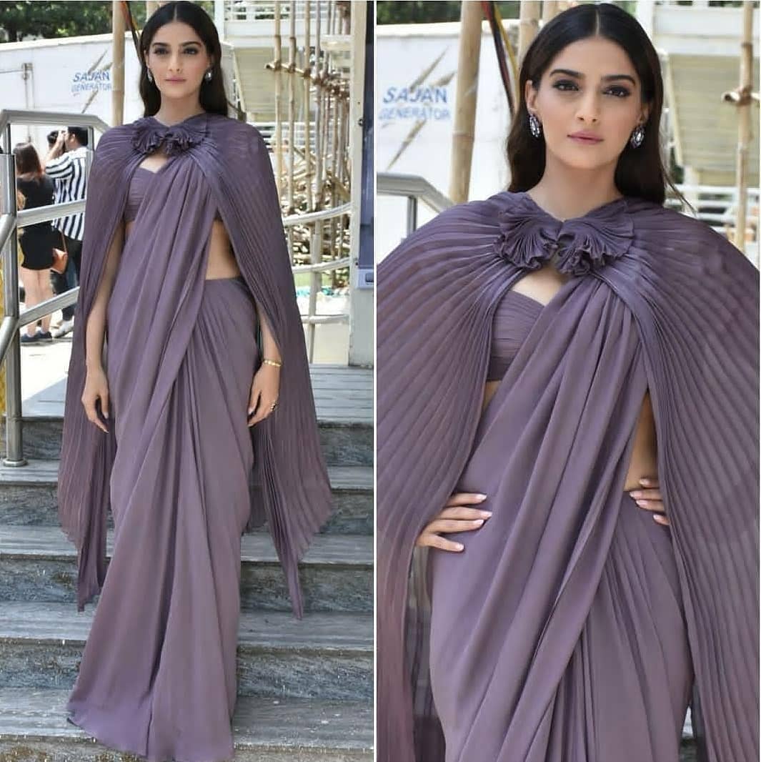 Sonam Kapoor is quite famous for trying new dresses or trying common dresses in a new way and sari is no exception. Sonam Kapoor is very much seen wearing sari in different styles and patterns. Recently also, Sonam Kapoor picked up two sari styles for two different occasions. In the first look she combined a shirt with sari and in the second look she opted for a matching cape on the sari.