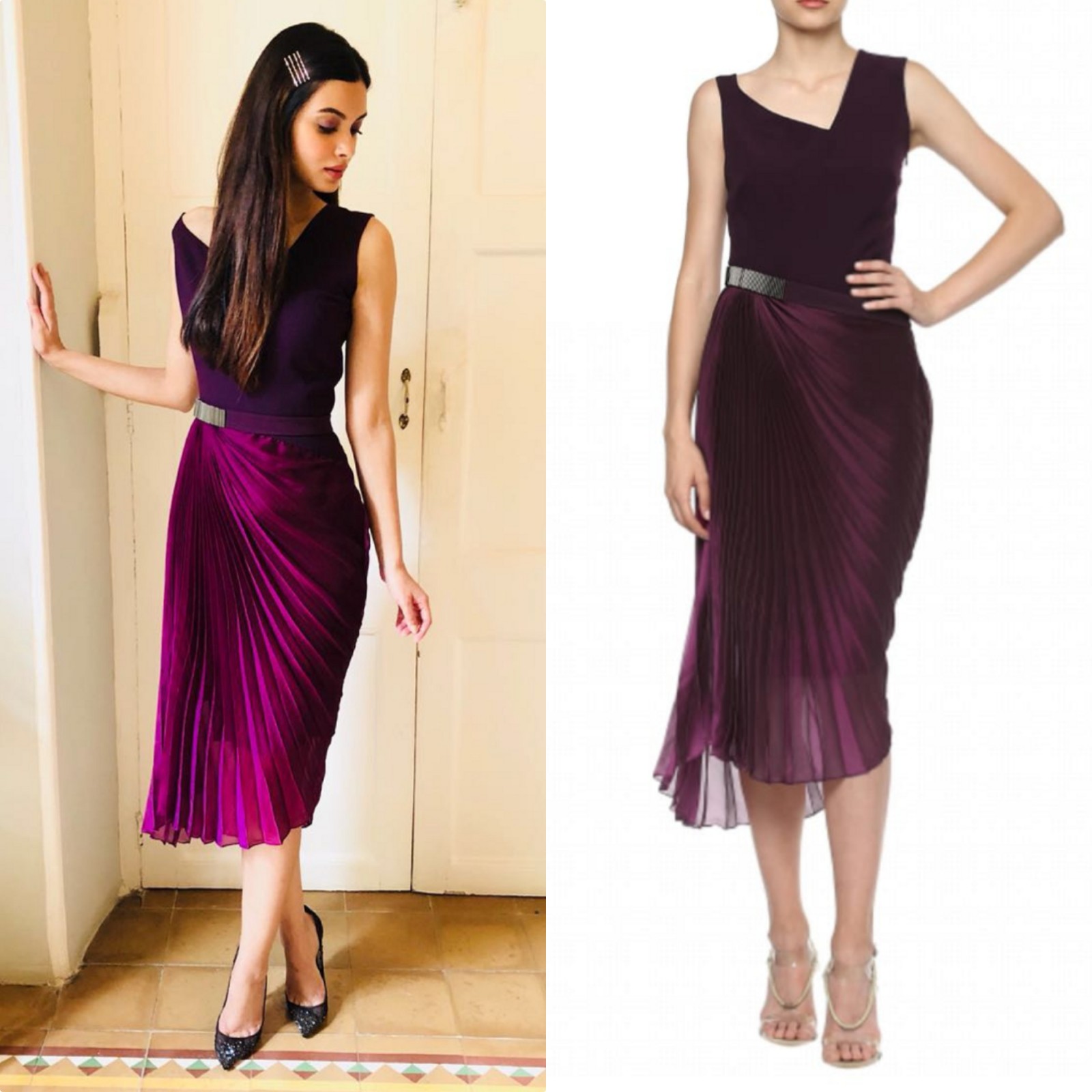 Diana Penty picked up a purple sleeveless knee length dress by designer Amit Aggarwal along with black Louboutin pumps for the recent rounds of promotion of her upcoming movie ” Happy Phirr Bhaag Jaegi”. Open straight hair and minimal jewelry finished off her look! Diana looked pretty.