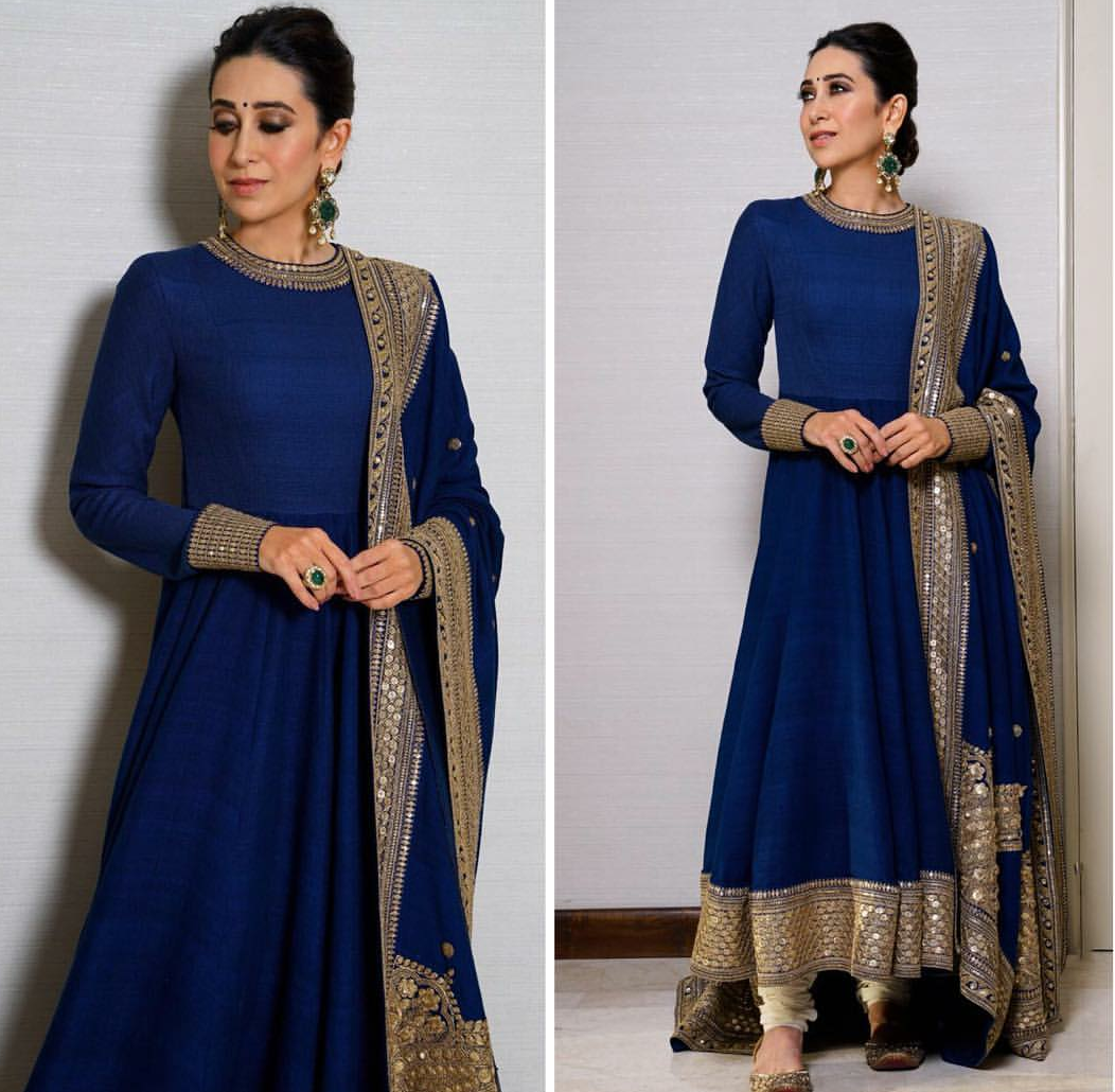 Karisma Kapoor Looks Stunning in This Navy Blue Suit by designer Sabyasachi. Long jhumki earrings, a hair updo and a bindi finished off her look! It is difficult to say which one is prettier, the actress or the Sabyasachi ensemble!