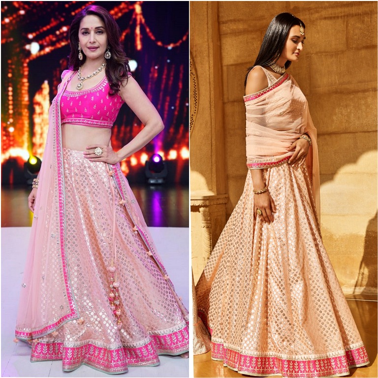 For tapping the recent episodes of the Dance Dewaane TV Show, Madhuri Dixit picked up a lehenga choli by designer Anita Dongre. The actor finished off her look with side swept open hair along with bangles by Anita Dongre Pink City. Madhuri looked pretty and graceful!