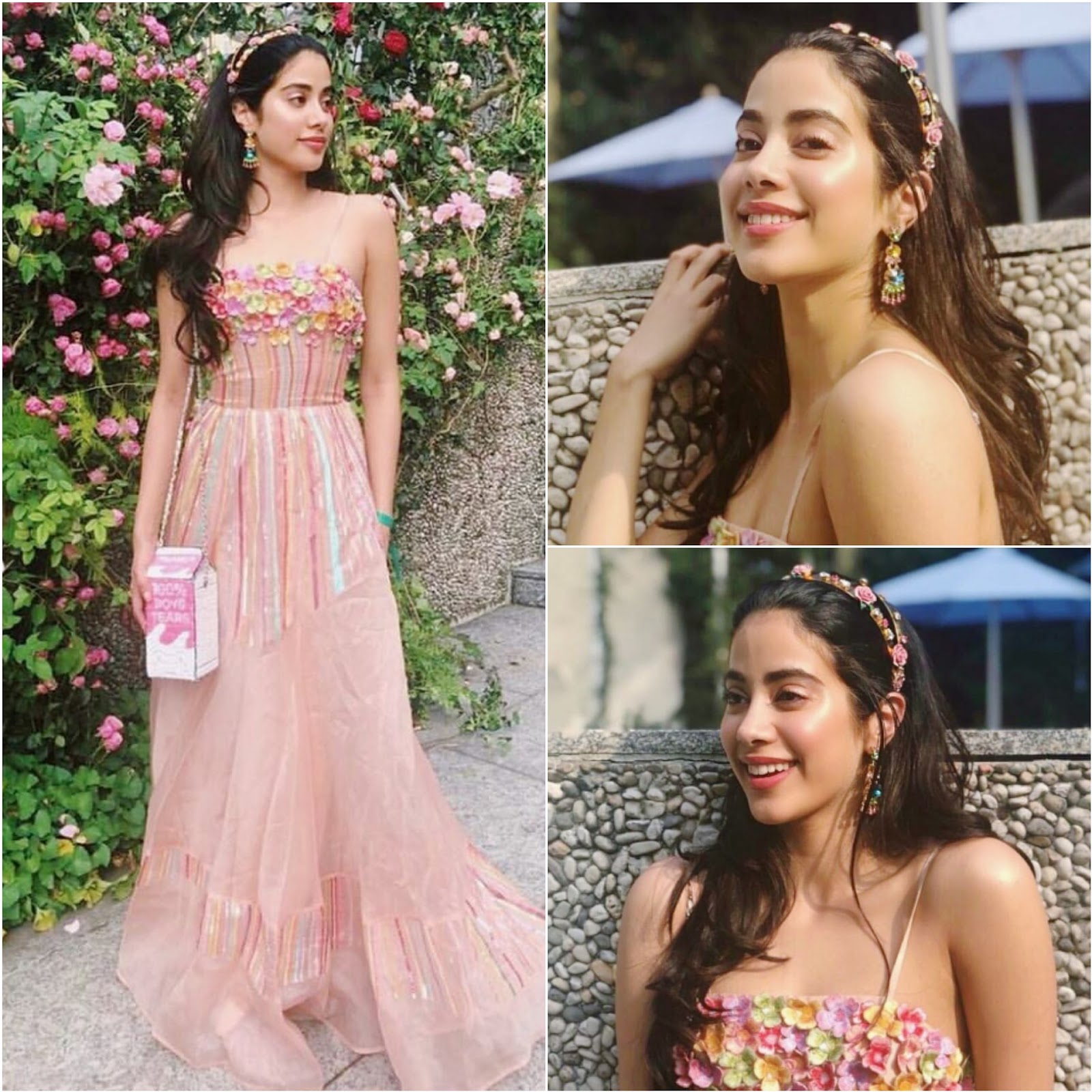 Janhvi Kapoor picked up a baby pink color gown by designer Rahul Mishra for the recently held Esha Ambani engagement bash. Open hair with flower tiara made her look prettier. She finished off the look with a “100% Boys Tears packet handbag” along with multi color earrings. There is no denying that Janhvi looked like a dream!