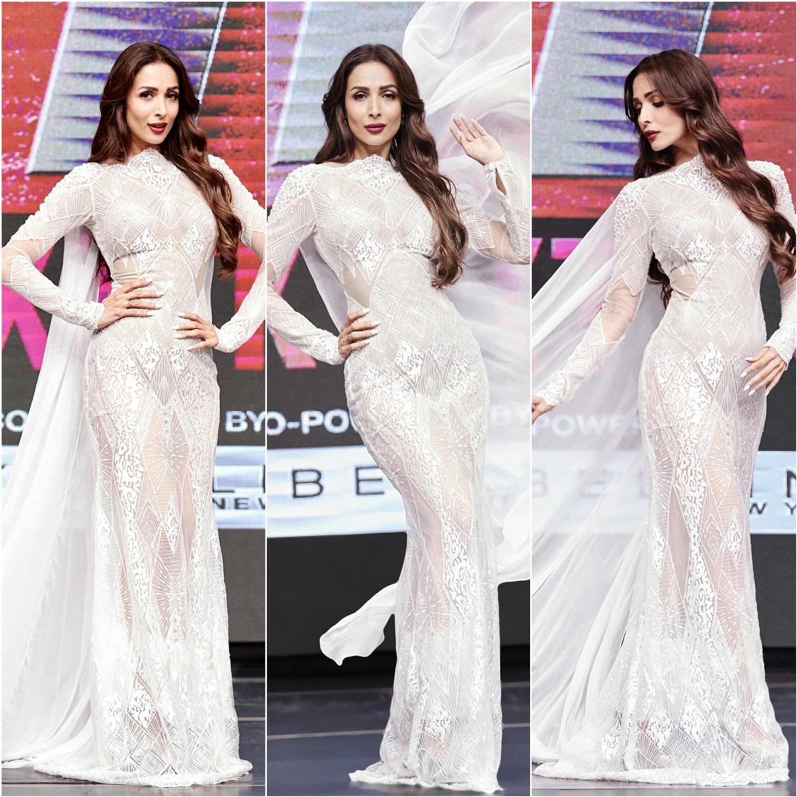 Malaika Arora Khan picked up a white embroidered floor length dress by designer Charbel Karam for the finale of India’s Top Model. Open wavy hair and a dark lip shade finished off her glamorous look!