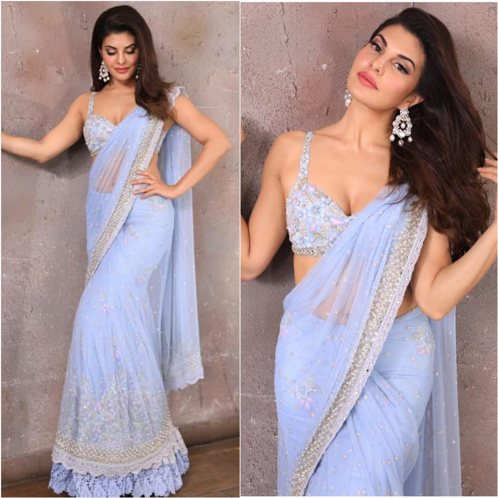 For attending the recently held Diwali bash by Shahrukh Khan, Jacqueline Fernandez picked up a pastel blue sari by designer Arpita Mehta and her jewelry was by Anmol Jewelers. Her look got finished off with mild makeup and open hair.