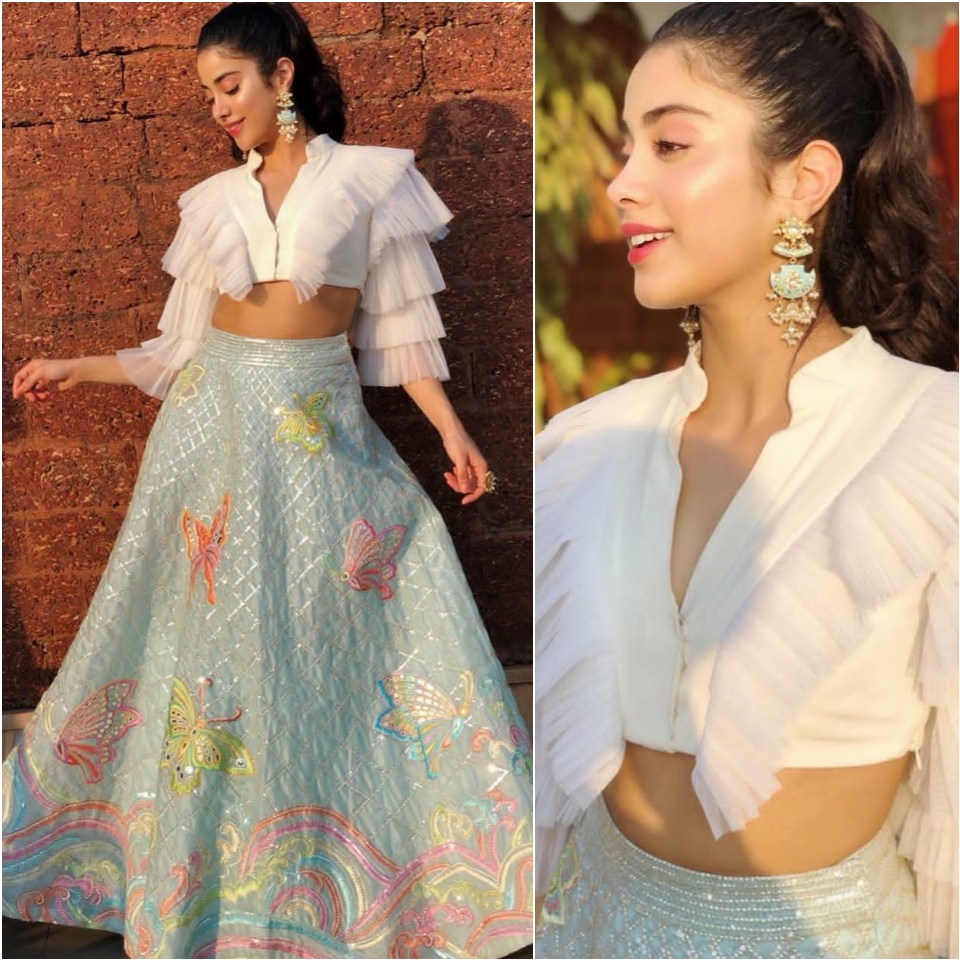 Janhvi Kapoor opted to wear a top and skirt by designer duo Abu Jani Sandeep Khosla for the recently held International Film Festival Goa 2018. Heavy earrings and a pony tail finished off her look! Janhvi looked gorgeous.