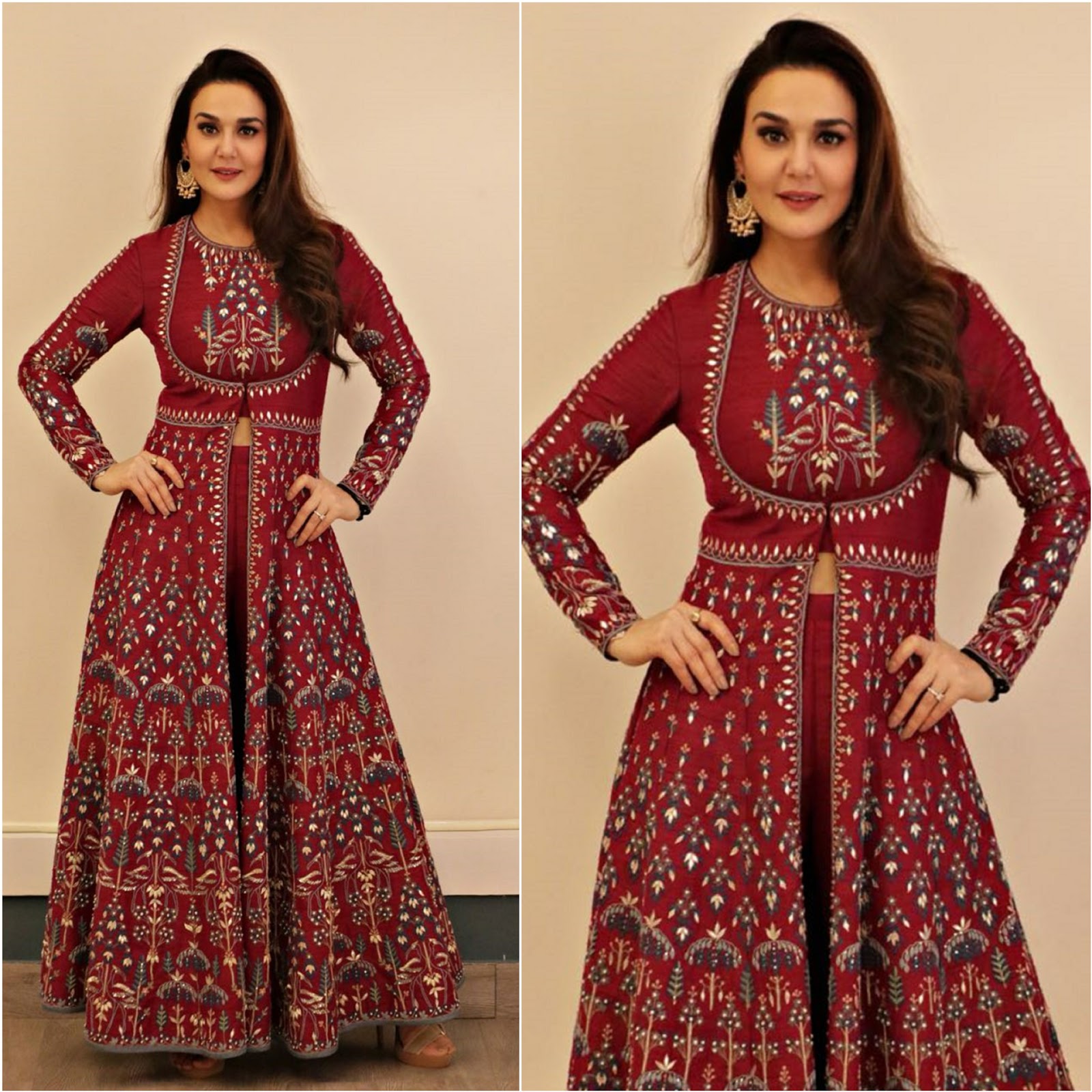 Preity Zinta Wore a floor length anarkali suit by Anita Dongre for her recent appearance at the Big Boss 12. Side swept open hair and mild makeup finished off her look! Preity looked nice.