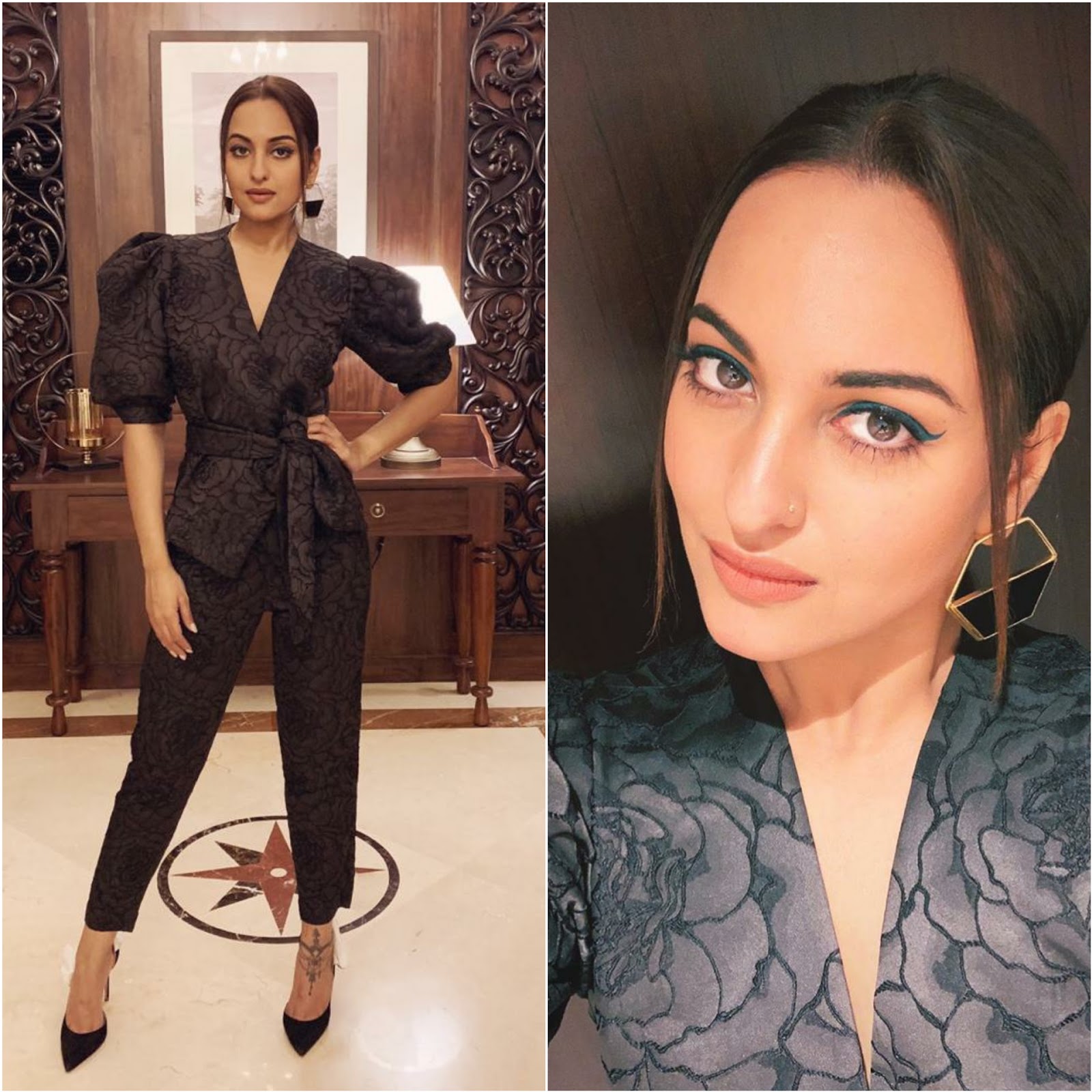 Sonakshi Sinha Wore a pant suit by Romy Collection which she paired with earrings by Varnika Arora for a recent event. A center partitioned pony and mild makeup finished off her look! Miss Sinha looked pretty in this look! What say?