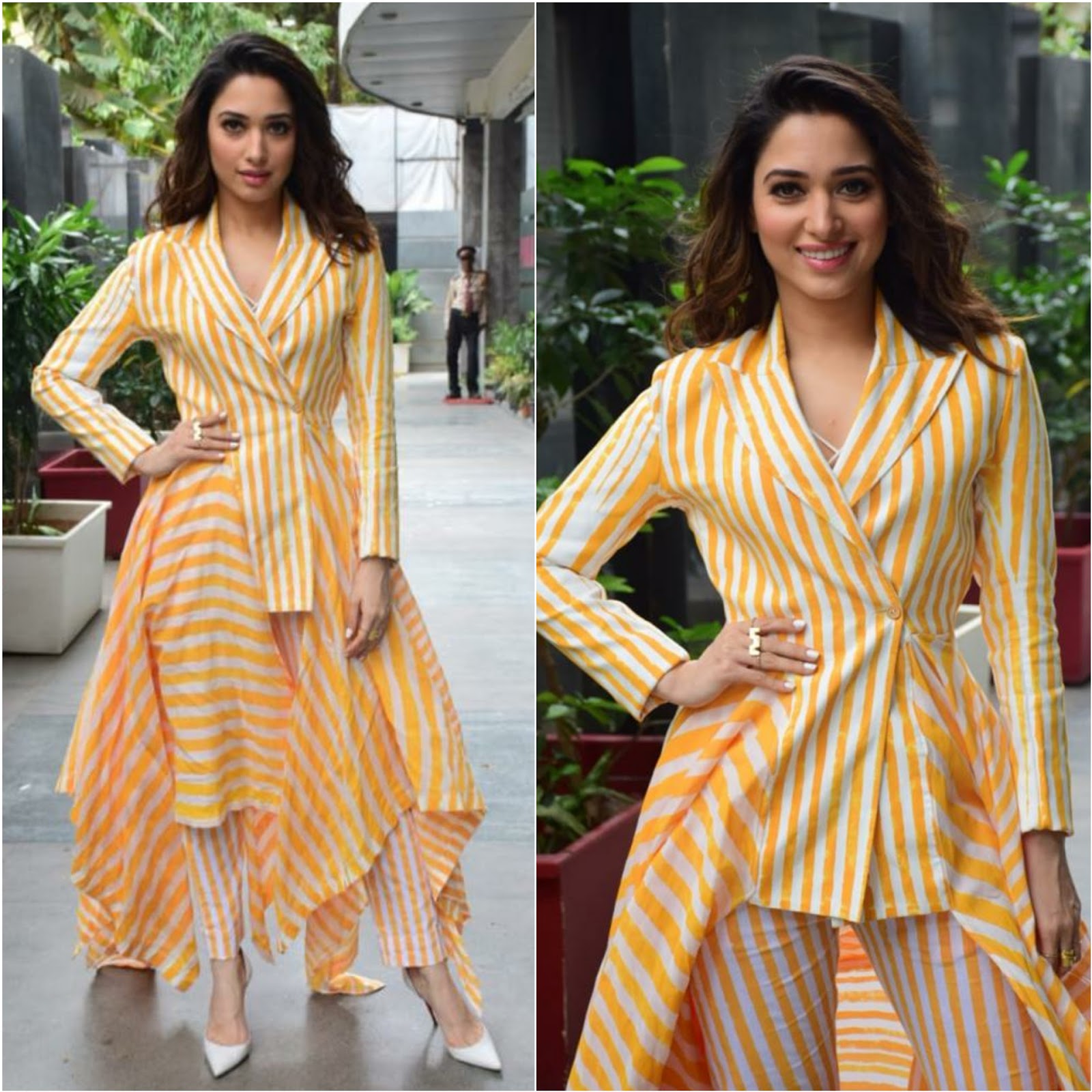 Tamannaah Bhatia wore an outfit by designer Mehammed Mazhar for Khamoshi promotions. She kept her hair open and wore white pumps by Louboutins. Overall Tamahhaah looked pretty! Like or Not?