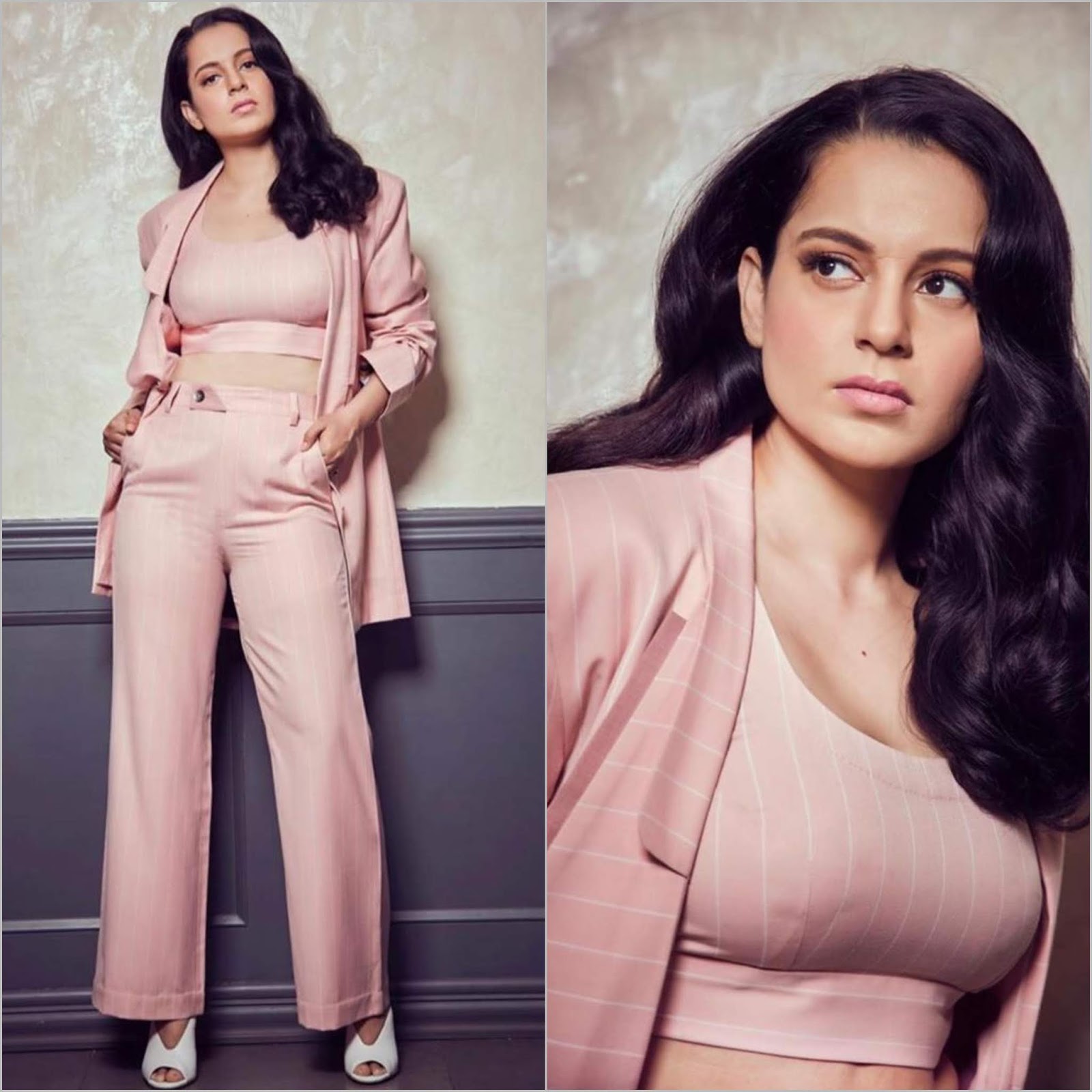 Kangana Ranaut was seen wearing a baby pink pant-suit by Two Point Two for the promotions of her upcoming movie “Panga”. Open hair and white heels finished off her look!