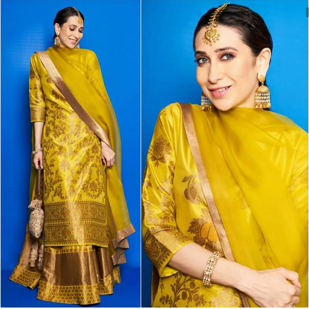 Karisma Kapoor was recently seen wearing an outfit by Payal Khandwala. Her jewelry was by Amrapali and Khanna Jewelers. She was styled by Esha Amin. Do you like Karisma in this yellow look?