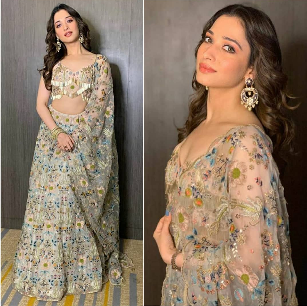 For a recent event, Tamannah Bhatia opted to wear a lehenga choli by designer Payal Singhal. Heavy earrings and open hair finished off her look!