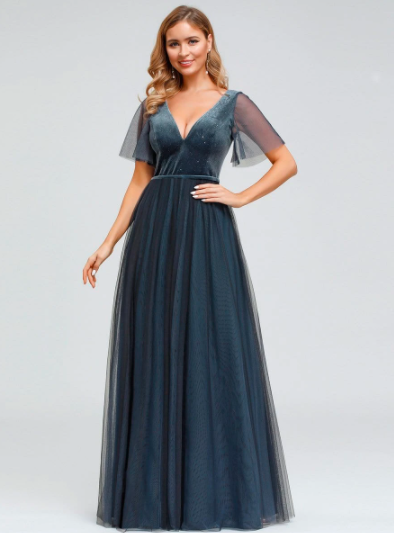 Women’s V-Neck Floor Length Tulle and Velvet Evening Dresses