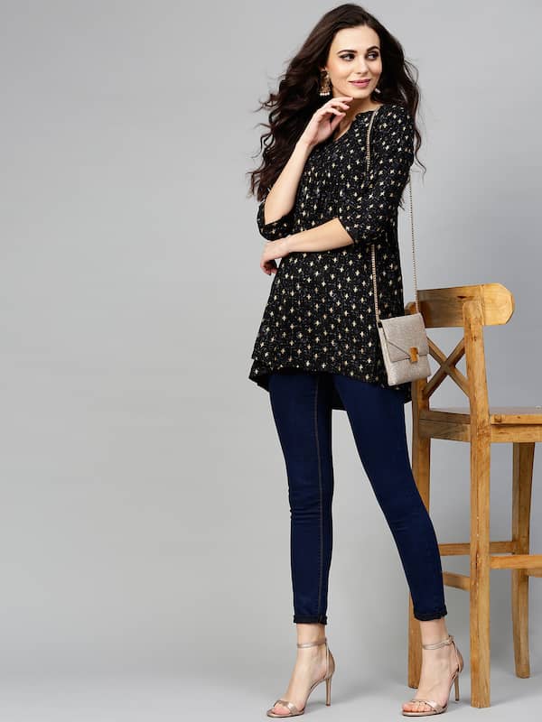 - Style your cotton Kurtis with denim – Denim, or more specifically the skinny jeans ensure that these casual wear for women look even better and admirable. You can just stick to the basic blue jeans or play with the shades like black, pink or whites. As far as they pair well with your Kurtis, who cares! And the best perk of pairing these with your Kurtis is that they match all of their styles. Like, anarkali looks smart with denim and so does an A line kurta and so on! Just wear a smart pair of shoes or sandals to go with it and you’re ready to conquer the world with these on!